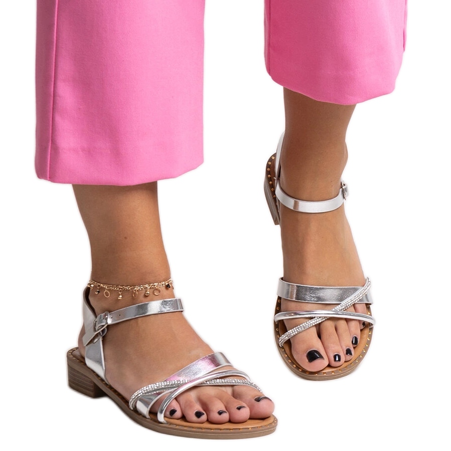Silverfärg och subtila strass ger sandalerna en speciell glöd, tack vare vilken du kommer att skapa oförglömliga stiliseringar, både dagligen och för speciella tillfällen. Dessutom tillåter spännet ett enkelt och snabbt fästelement, vilket säkerställer bekvämlighet med användning och säkerhet att sandalerna kommer att förbli på plats även under intensiva sommaraktiviteter.
