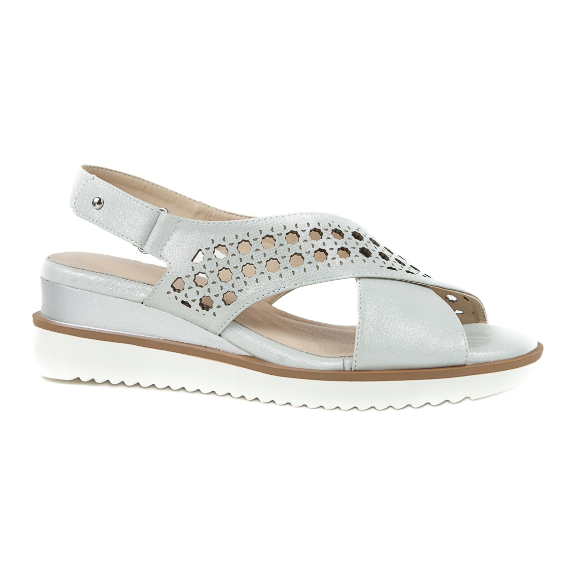 Upptäck elegans och komfort i en av de senaste modellerna av sandaler från M.Daszyński - silver Daszyński 1838 kilsandaler med en gråmetallic finish. Dessa iögonfallande sandaler är ett måste i garderoben för varje kvinna som uppskattar stil och klassiskt mode.