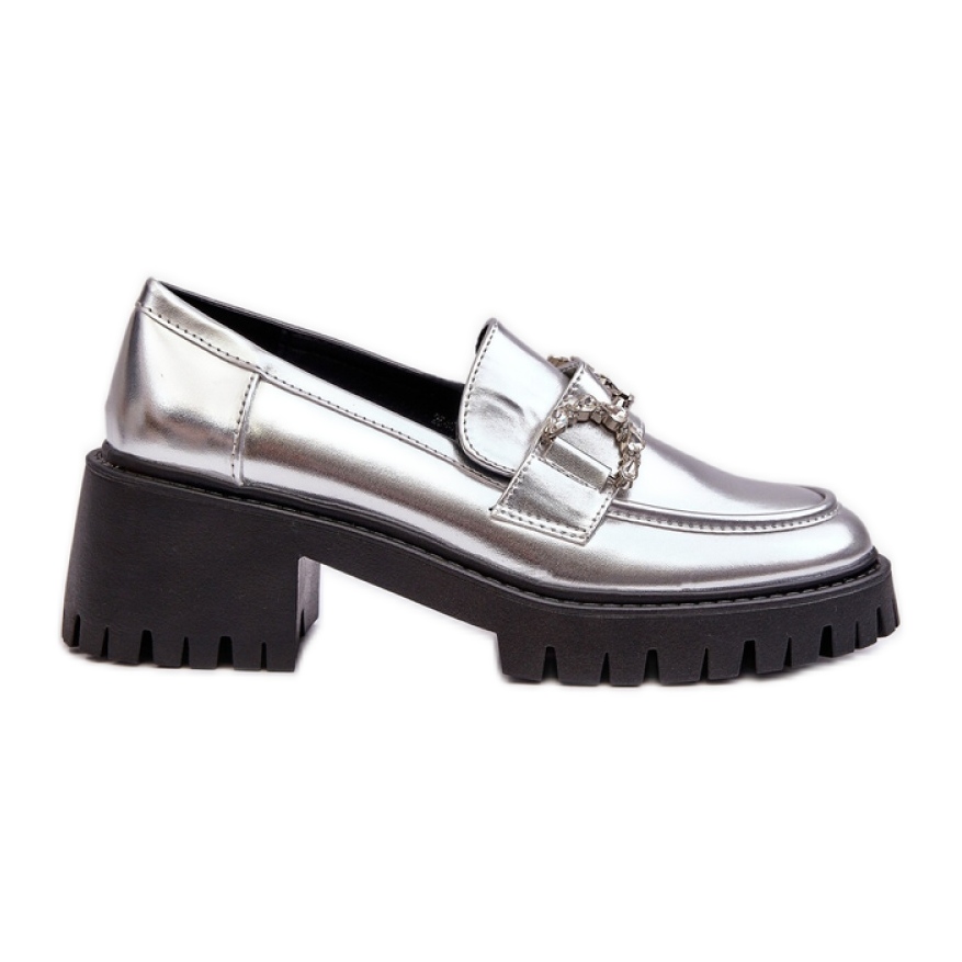 På framsidan av mockasinerna finns en smyckedekoration som fångar ögat och ger skorna en unik karaktär. Den förstyvade hälen garanterar en perfekt passform, vilket gör denna modell perfekt för höstdagar. Silver Loafers kommer att vara ett stort komplement till många stilar - från avslappnad till mer formella.