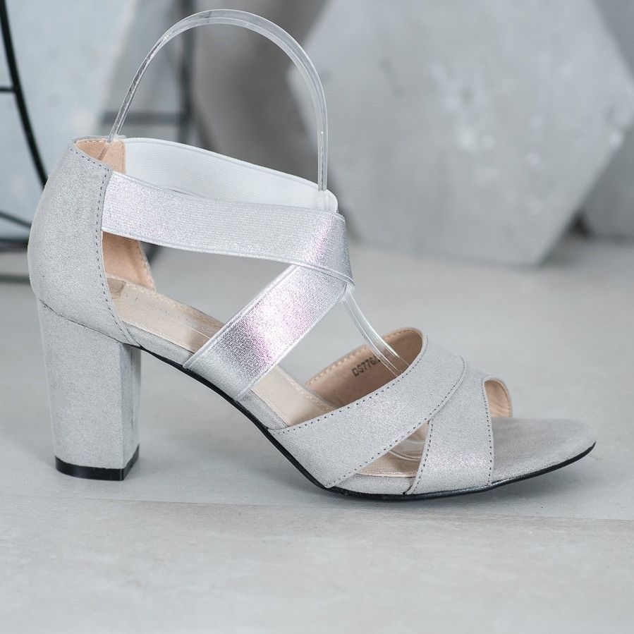 Dessa sandaler är gjorda av silvermaterial som imiterar läder och gläder sig med sin subtila glans. Den främre delen av skorna är dekorerad med två korsade remsor av material som elegant exponerar fötterna. Dessutom finns det ett dekorativt motiv på handleden av glänsande material, vilket framhäver deras unika karaktär.