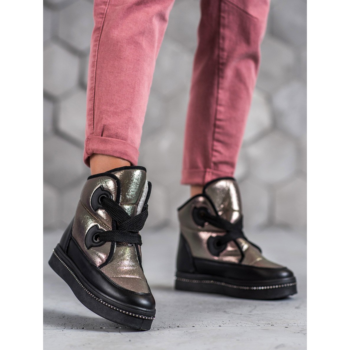 Upptäck måttlighet och funktionalitet med Weide snökängor i en elegant metallisk grå färg. Dessa snygga damskor är ett perfekt val för vinterdagar, vilket kommer att ge inte bara komfort, utan också ett fantastiskt utseende. Tack vare den höga ovandelen, 12-13 cm höga, kommer dina fötter att skyddas mot frost, och den specialprofilerade sulan med slitbana garanterar utmärkt grepp på snötäckta ytor.