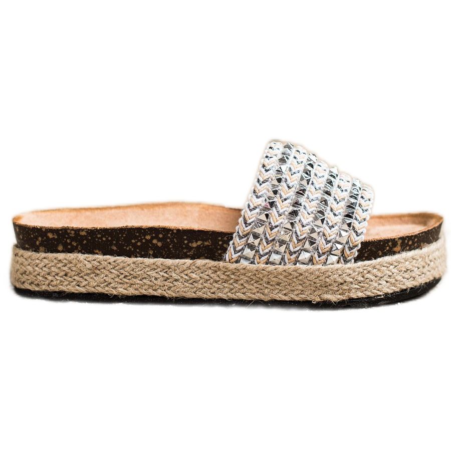 Här är det perfekta förslaget för våren och sommaren - silver Groto Gogo flipflops med nitar i en moderiktig grå färg. Dessa casual flip-flops är ett perfekt val för kvinnor som värdesätter stil och komfort varje dag. Tack vare den öppna hälen och slip-on-fästet är det extremt enkelt att ta på dem, och bärkomforten säkerställs av en sula av plast, som dessutom har en slitbana för bättre grepp.