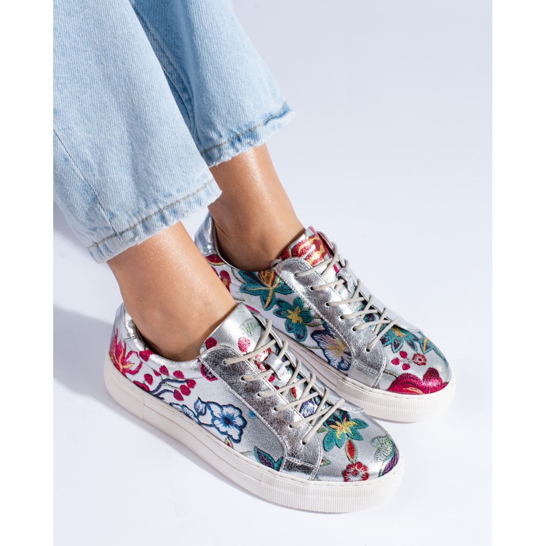 Silver sneakers med blommor från Shelovet kombinerar en sportig karaktär med en touch av elegans. De är perfekta som vardagsskor - från tidig vår, genom sommarmånaderna, till varmare höstdagar. Dessa flersäsongsskor är ett utmärkt val för kvinnor som värdesätter skor som matchar en mängd olika stilar och ger komfort hela dagen.