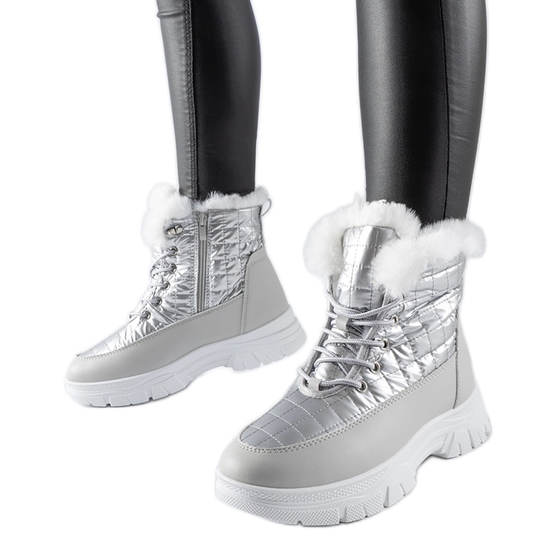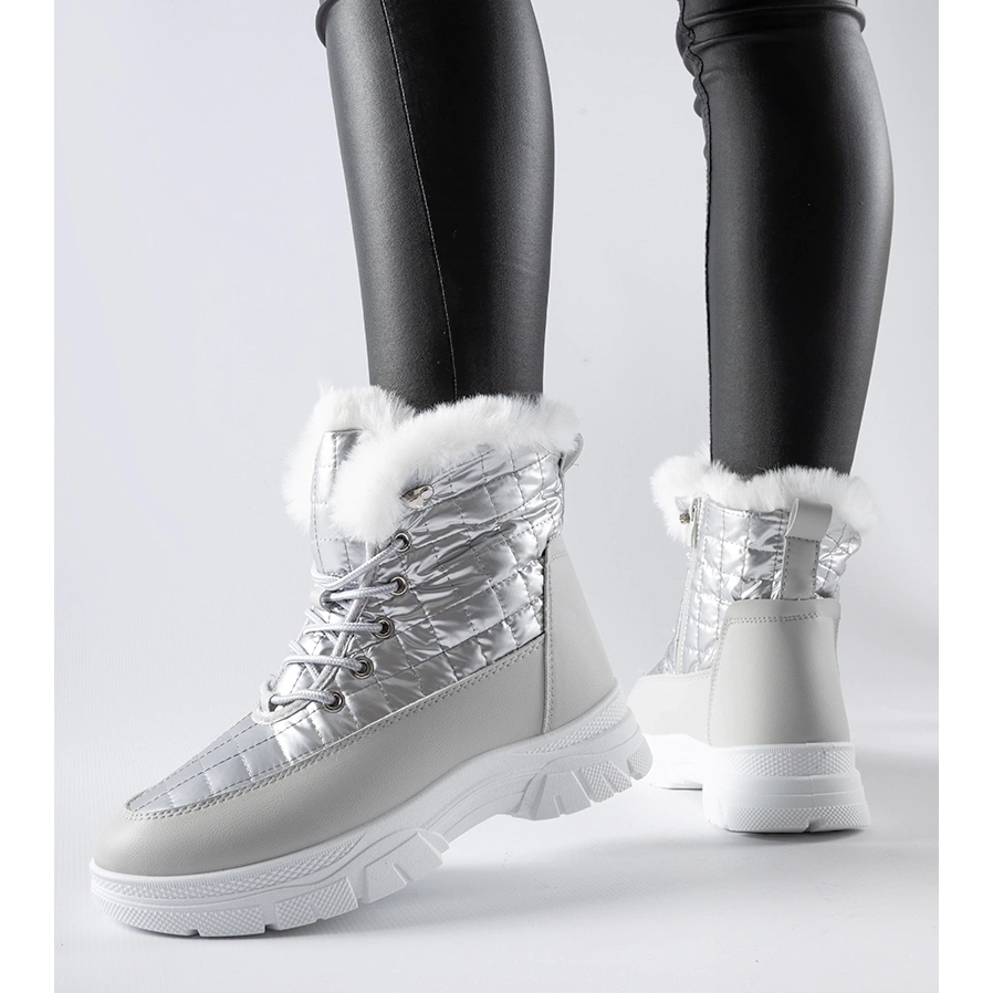 Snygga, praktiska och varma - silver twoyn snöstövlar är ett idealiskt förslag för vinterdagar. Tillverkad av ekologiskt läder med en metallisk glans, med en mjuk päls och en värmande innersula, ger de tröst även under frost. Höga kuber och icke -slip gummisula garanti stabilitet på hala ytor, och 4 cm plattformen lägger till en fashionabel karaktär och höjer figuren något.