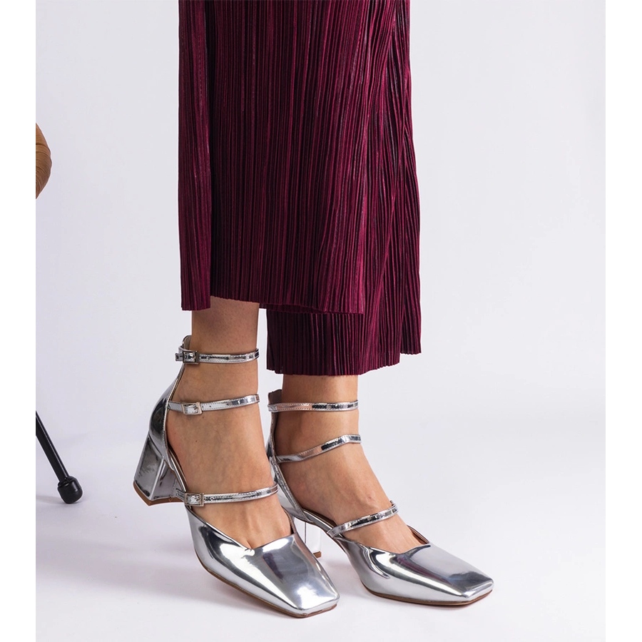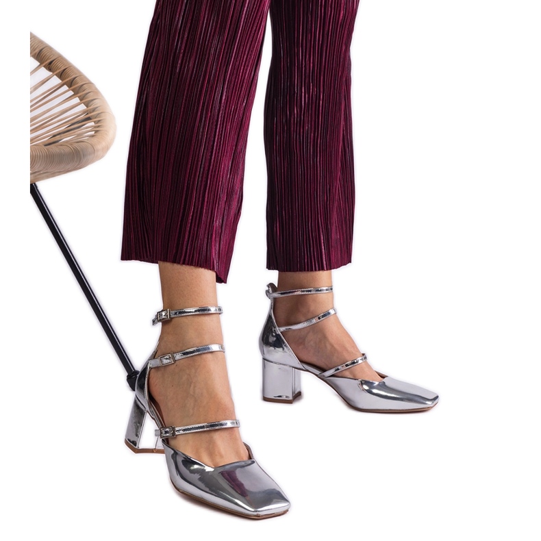 Detaljer: Silverpumpar lackade på ett stolpe med spännen