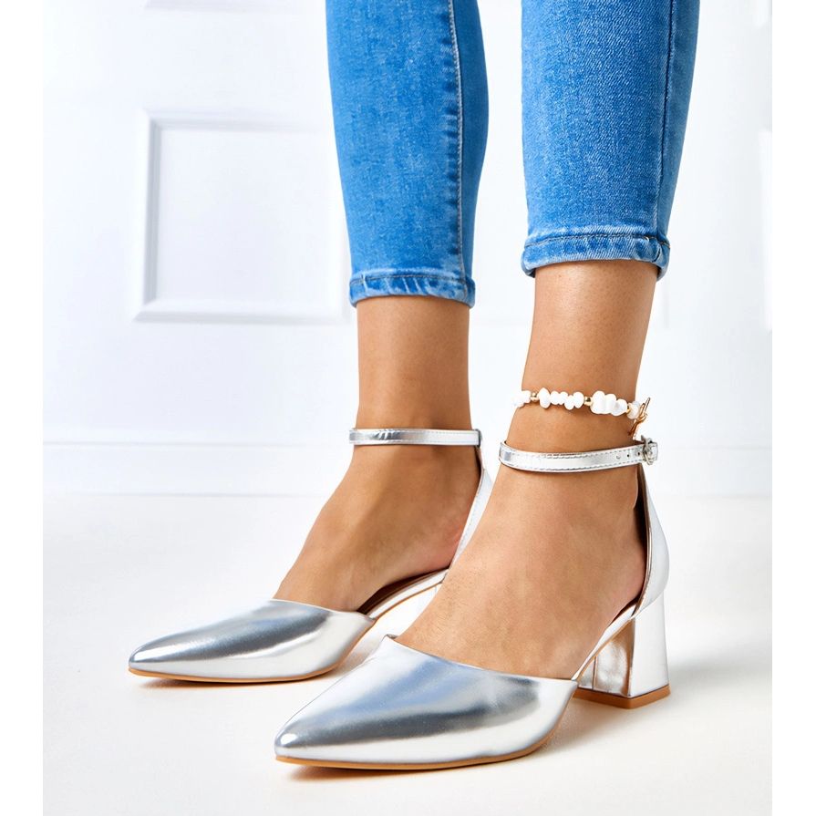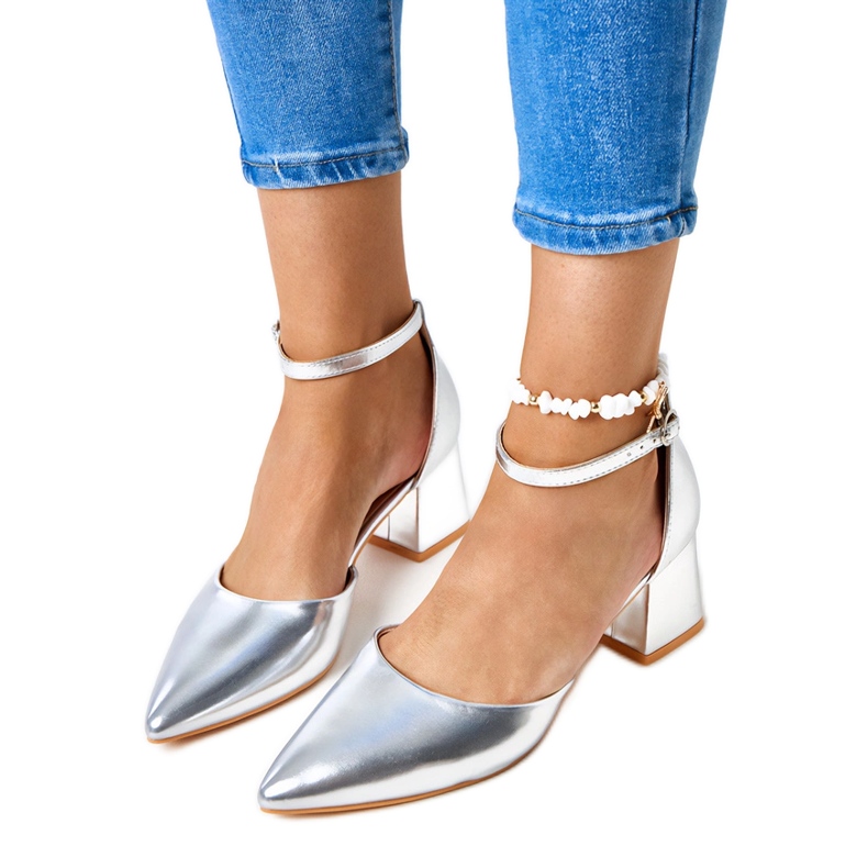 Silverfärgen ger prakten av all stilisering, och den spetsiga näsan ger dem en mycket feminin karaktär. Tack vare hälhöjden på 6 cm är pumparna perfekta för både eleganta tillfällen och för dagliga kombinationer. Fästning för ett spänne runt vristen säkerställer stabilitet och betonar benen, och den bruna plastsulan är både snygg och praktisk.