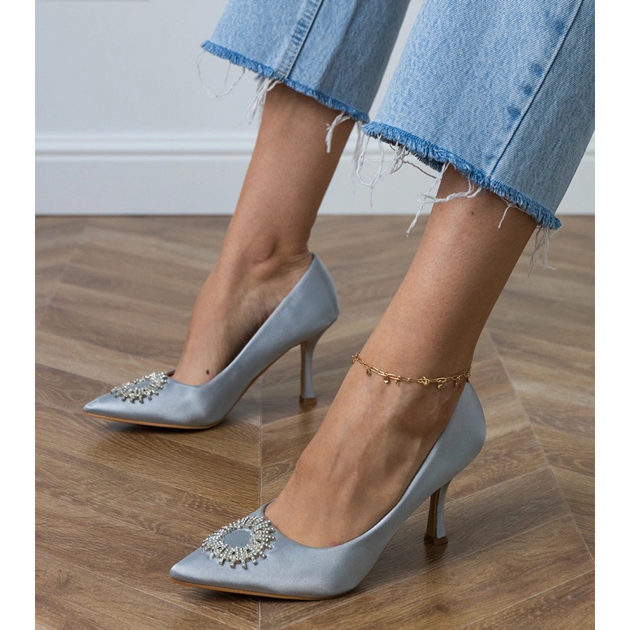 Pumpar kännetecknas av en spetsig tå och en sexig häl med en höjd av 8,5 cm, vilket optiskt förlänger benen och ger nåd till varje figur. Deras subtila färggento i kombination med vackert inbäddade zirkoner får dessa skor att lysa och locka utseende, perfekt matchande både kväll och mindre formella stiliseringar.
