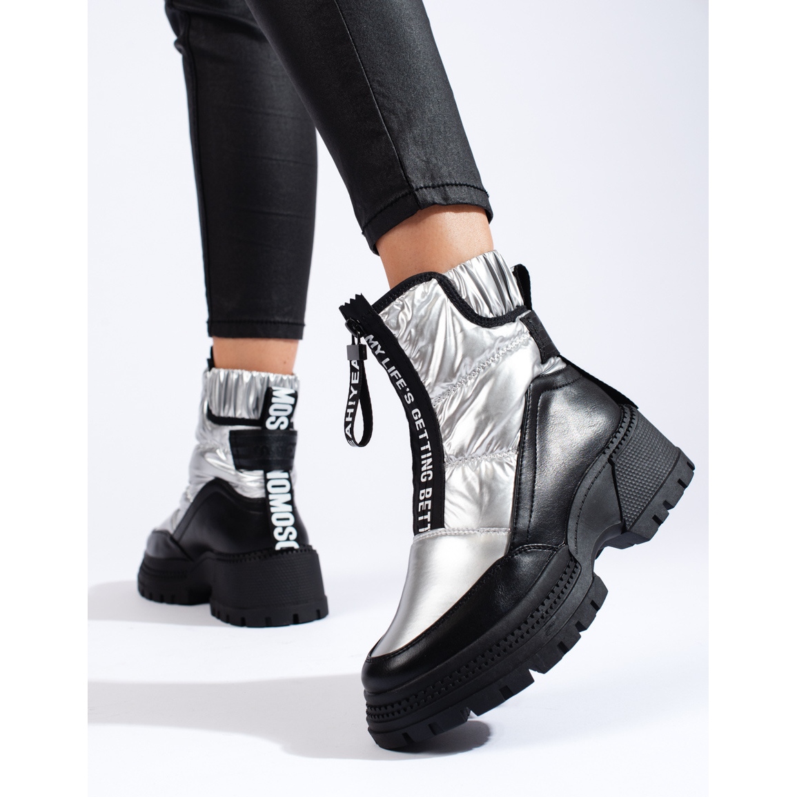 Eleganta kvinnors snöstövlar varumärken Shelovet i en modern silverfärg. Kombinationen av ekologiskt läder och textilmaterial ger effekten av en modern, avslappnad look, samtidigt som den ger komfort och hållbarhet dagligen. Modell med en inbyggd, mjuk häl och en praktisk skjutreglage - lätt att ta på sig och stabil när du går.