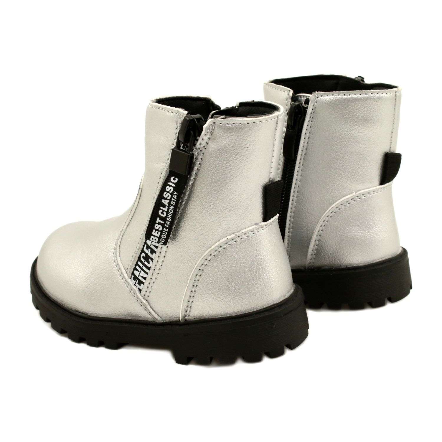 Eleganta silverstövlar för Miss 22DZ23-5268-flickan är de perfekta skorna för svalare dagar. Tillverkad av högkvalitativt ekologiskt läder lockar uppmärksamhet med en fashionabel, metallisk finish. Den mjuka, svarta pälsen inuti ger trevlig värme, och den praktiska reglaget gör det lättare att ta på sig och ta av. Termo-crack-sulan är icke-halk, vilket ökar säkerheten under promenader på våta eller hala ytor.