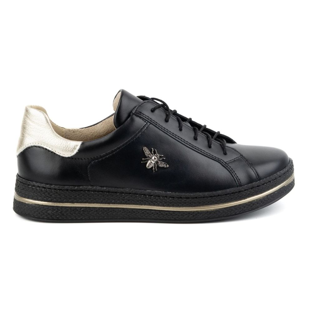Olivier Women's Shoes Leather Sneakers Style 1190 in Black är ett utmärkt val för varje modern kvinna som vill kombinera komfort med elegant stil. Dessa unika sneakers kännetecknas av en subtil, delikat glans av en gyllene lapp på sidan och en gyllene häl, vilket ger dem en något lyxig karaktär.
