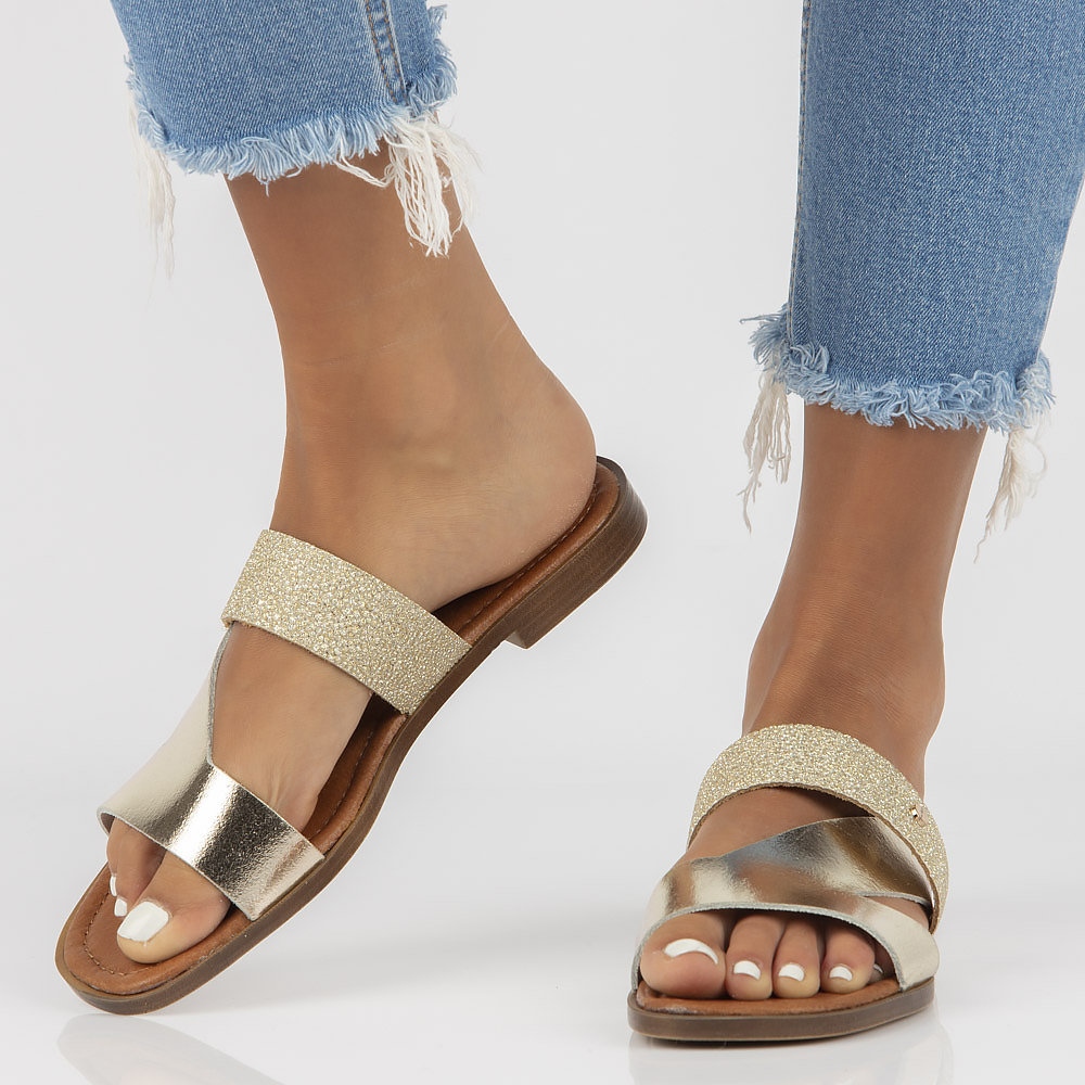 40260-modellen kännetecknas av en platt klack på 1,5 cm och en låg plattform på 0,5 cm, vilket säkerställer stabilitet och komfort vid användning. Tåns runda form ger subtilitet och den gyllene färgen gör dem till ett idealiskt val både för vardagsutflykter och för mer eleganta tillfällen.