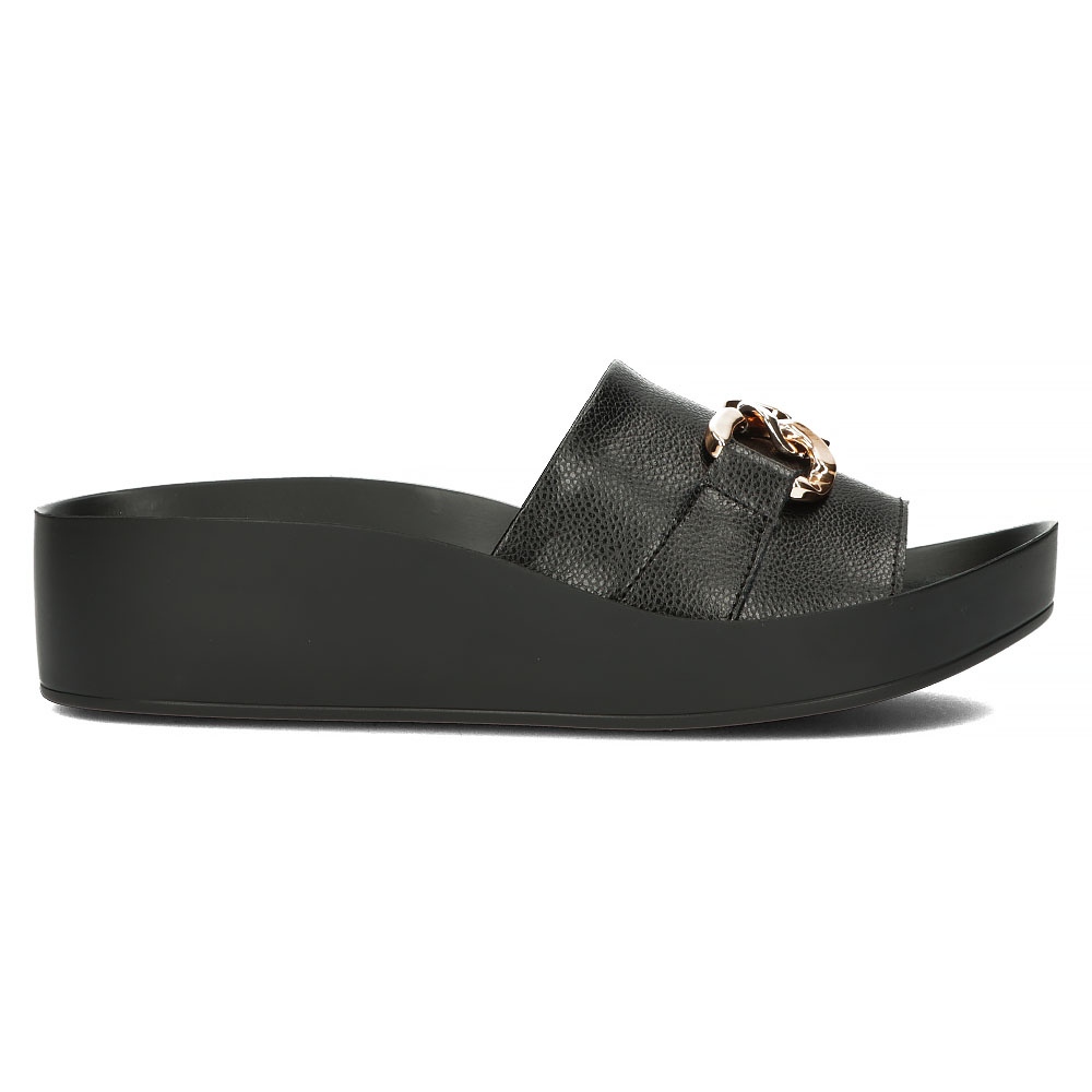 Flipflopsna har en rund tå och ingen tå, vilket gör dem perfekta för varma dagar. Deras 4,5 cm höga syntetmaterialsula och 2 cm höga plattform garanterar stabilitet och komfort när du går. En ytterligare fördel är den eleganta kedjan som dekorerar flip-flopsna, vilket ger dem en unik karaktär.