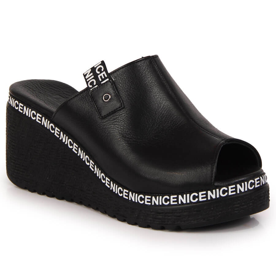 Detaljer: Skinntofflor för kvinnor på en svart Artiker-kil
