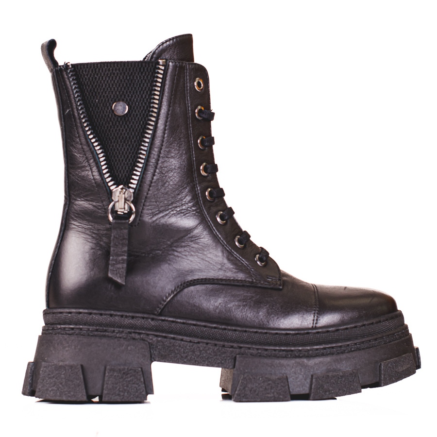 Ankelhöga ankelboots med 5 cm platt klack och 3,5 cm plattform erbjuder den perfekta kombinationen av stabilitet och stil. Den runda tån och den uppbyggda ovandelen, 24 cm bred, garanterar komfort och rätt passform. Dessutom är snörning och dragkedja på sidan praktiska lösningar som gör det lättare att ta på sig skorna.