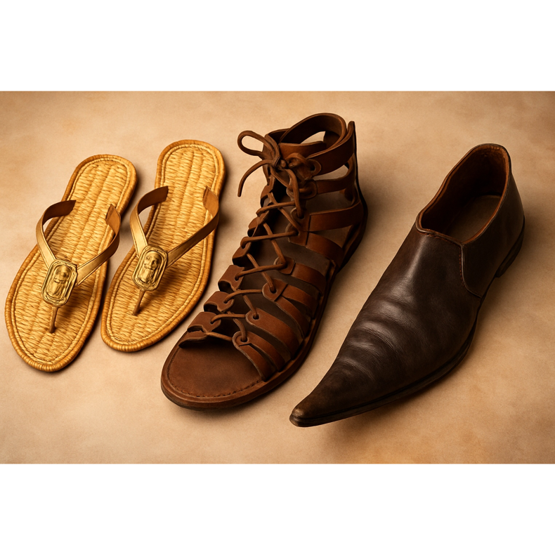 I det gamla Egypten var sandaler gjorda av flätad papyrus, vass eller läder populära. Deras form och material berodde på ägarens sociala ställning. Faraonerna bar utsmyckade sandaler med guldapplikationer, medan vanligt folk gick barfota eller i enkla sandaler. Egyptierna trodde att skor hade andlig betydelse och placerade dem ofta i gravar som utrustning för livet efter detta.