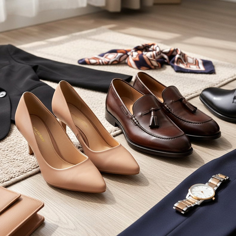 Varje kapselgarderob behöver ett par skor för mer formella tillfällen. För kvinnor är klassiska pumps med mellanklack (5-7 cm) i svart eller nude det perfekta valet. Denna modell kommer att fungera bra både på kontoret och för middag på en restaurang eller en familjefest. För män kommer eleganta loafers eller derbyskor i en nyans av mörkbrunt eller svart att motsvara.