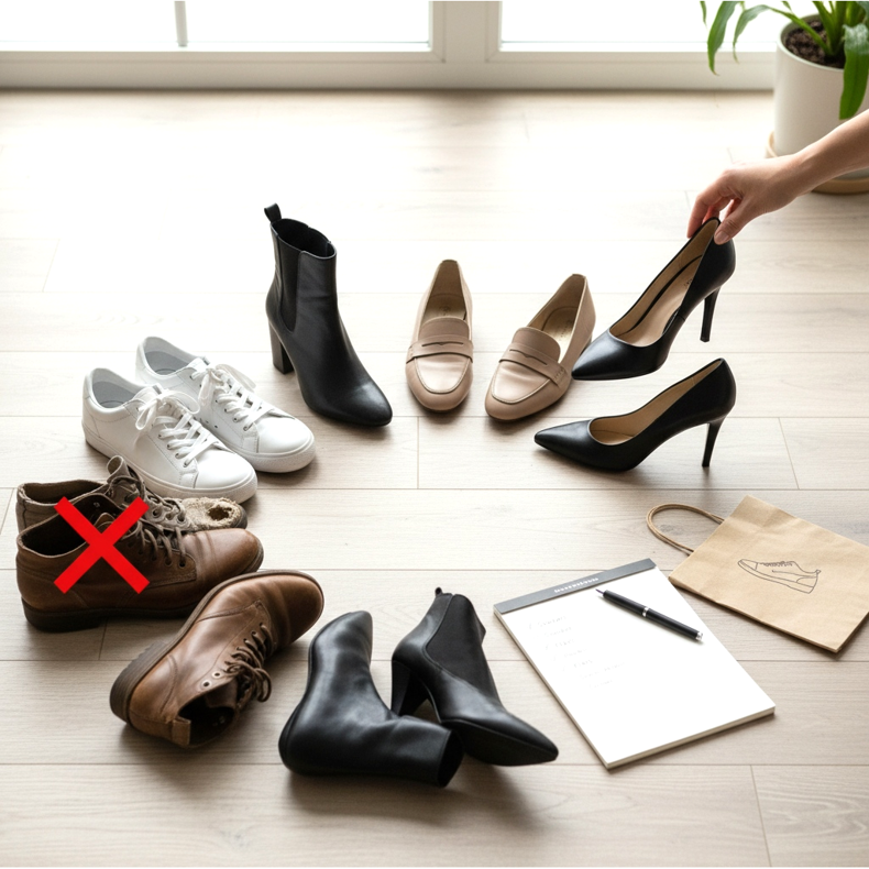 Att bygga en kapselgarderob är en process, inte ett engångsköp. Börja med att granska din nuvarande skokollektion – ta ut alla skor ur garderoben, bedöm deras skick, användbarhet och hur ofta du använder dem. Bli av med par som är slitna, obekväma eller bara inte går med någonting. Identifiera sedan luckorna – vilken av de fem nyckelkategorierna saknas i din garderob?