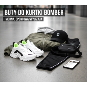 Det är också värt att uppmärksamma sneakers med karakteristiska detaljer - logotyper, ränder eller färgglada element som kan liva upp hela stylingen. Tänk dock på att inte överdriva med antalet mönster – om bomberjackan redan har ett tryck, välj mer dämpade skor.