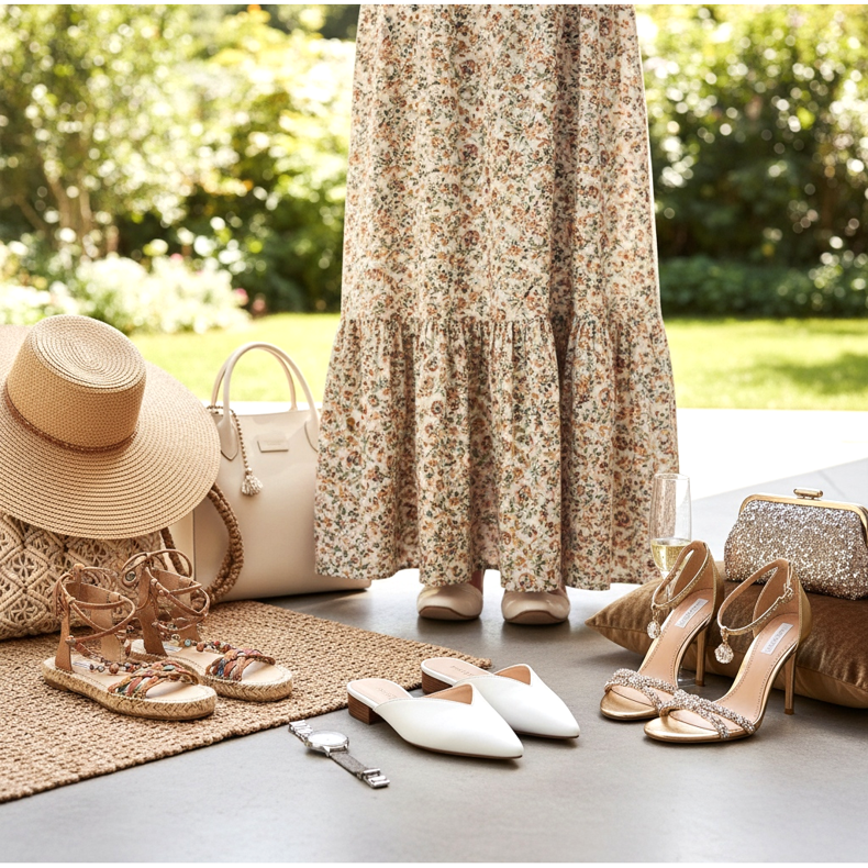 År 2026 är gladiatorsandaler för maxiklänningar moderiktiga - deras karakteristiska remmar sticker ut från under kanten av klänningen och skapar en iögonfallande detalj. Flipflops med klack eller plattform är ett bekvämare alternativ för längre utflykter. Kom ihåg att med en maxiklänning behöver du inte oroa dig för en platt sula – så länge klänningen inte släpar i marken är platta sandaler ett utmärkt och bekvämt val.