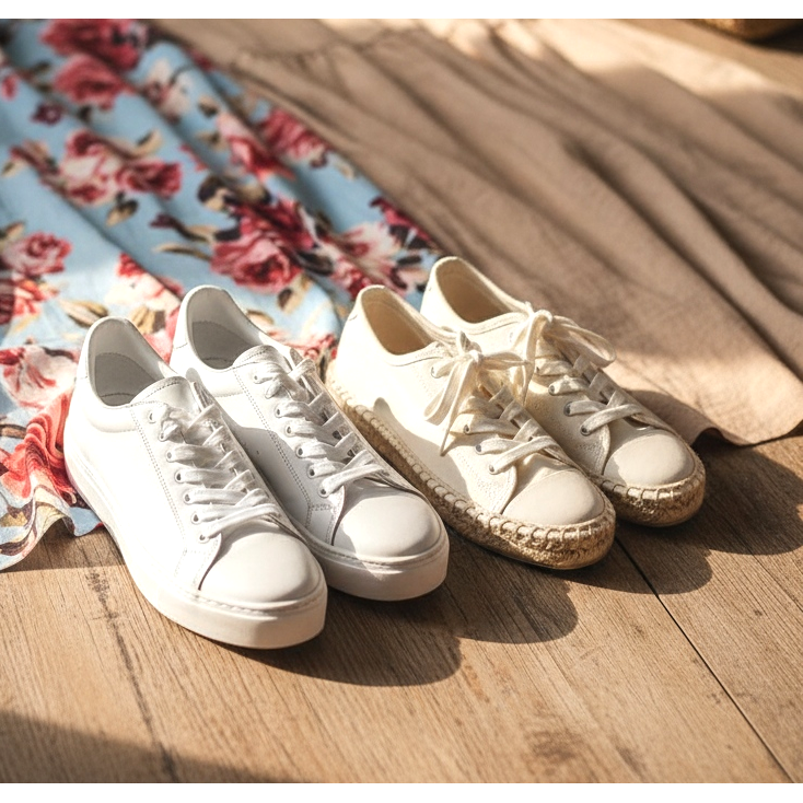 För en mer minimalistisk maxiklänning av linne eller bomull skapar ultratunna sneakers eller klassiska canvassneakers en avslappnad sommarlook. För en festival, en marknad eller en promenad runt staden - denna kombination är både bekväm och stilfull. Välj sneakers i neutrala färger (vit, kräm, beige) som inte kommer att krocka med mönstret på klänningen.