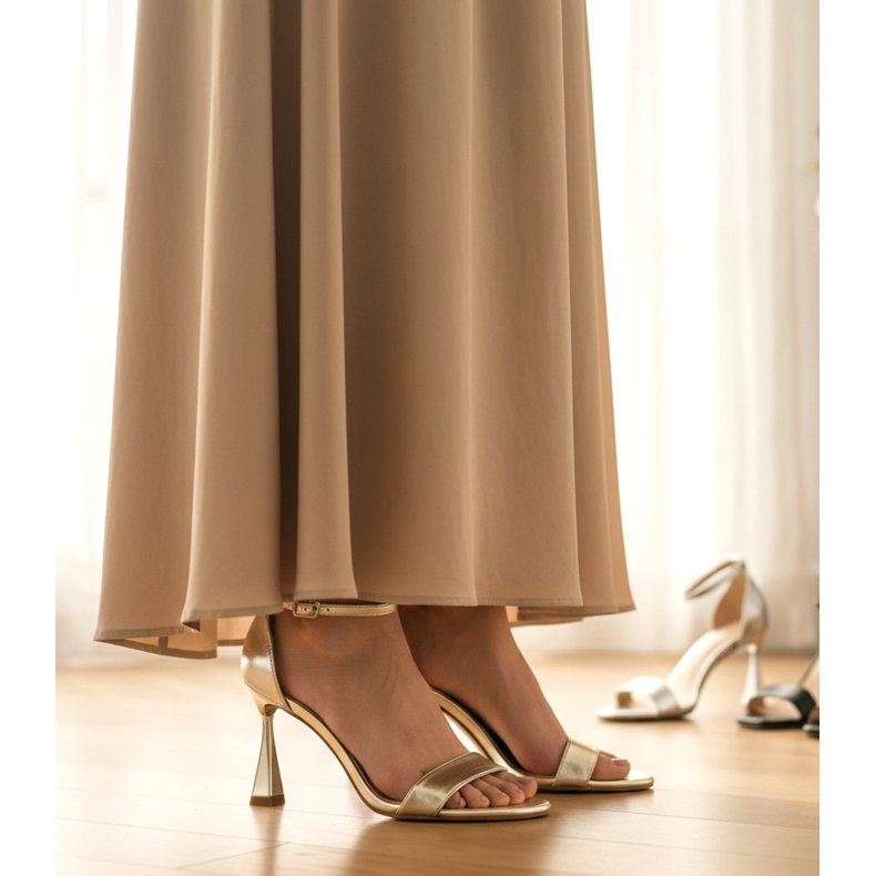 Viktig detalj: i en golvlång maxiklänning ska hälen vara tillräckligt hög för att inte gå på kanten av klänningen. 8-10 cm är en säker räckvidd. Högklackade sandaler med en delikat rem vid ankeln är särskilt imponerande eftersom de bara kan ses från under kanten av klänningen, vilket skapar en subtil och sensuell detalj. Metalliska höga klackar eller sandaler i guld eller silver passar perfekt till klänningar i neutrala färger: beige, vit och svart.