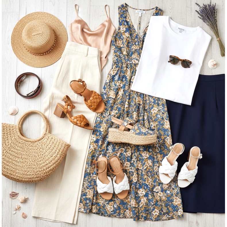 Smart casual: Kombinera dina kostymbyxor eller en trapets midikjol med lågklackade, vävda sandaler. En enkel silkeslen blus eller skjorta fulländar looken. Denna stil är exceptionellt elegant och perfekt för arbete eller informella affärsmöten.