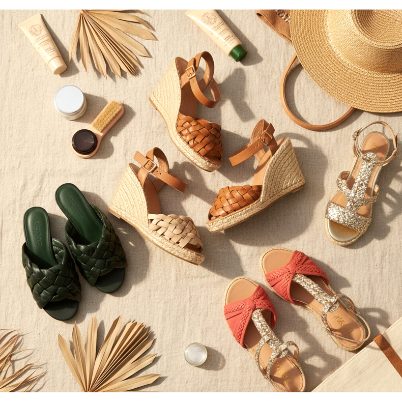 Vävda skor i naturliga färger är en klassiker - ljus beige, kamel, solbränna, naturlig brun, vit och kräm är absolut bas. Dessa färger harmoniserar med sommarens färgpalett och är perfekta för sommarsäsongens naturalistiska tyger.
