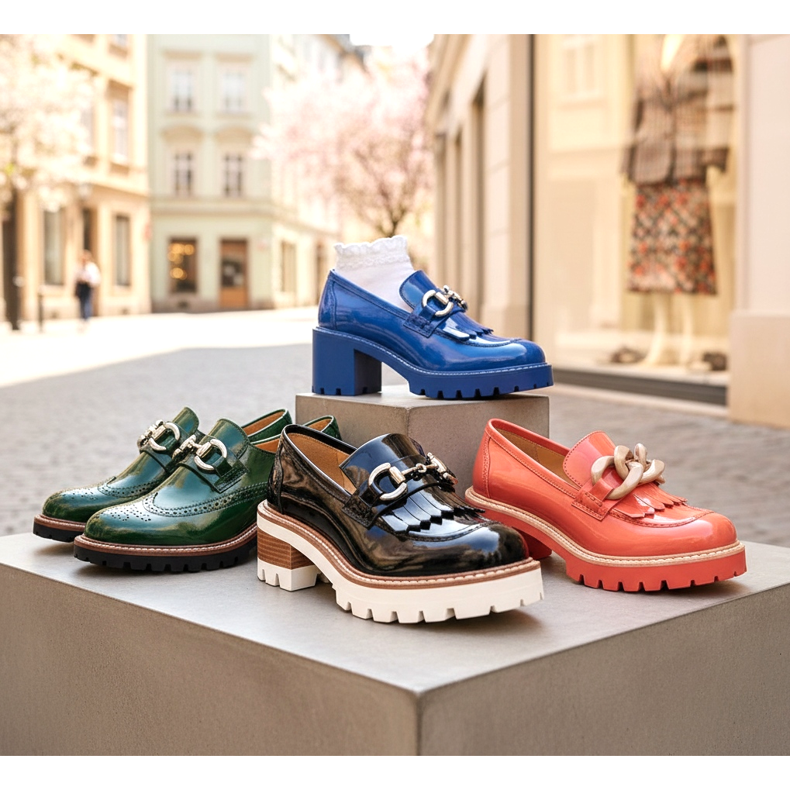 Loafers behåller en stark position i skotrenderna 2026. Den här säsongen dominerar modeller med lite mer avantgardistisk karaktär – loafers med tjock kontrastsula, modeller med muddar och dekorationer vid tån, samt patentvarianter i djärva färger, som blåklintblå, flaskgrön eller korall.