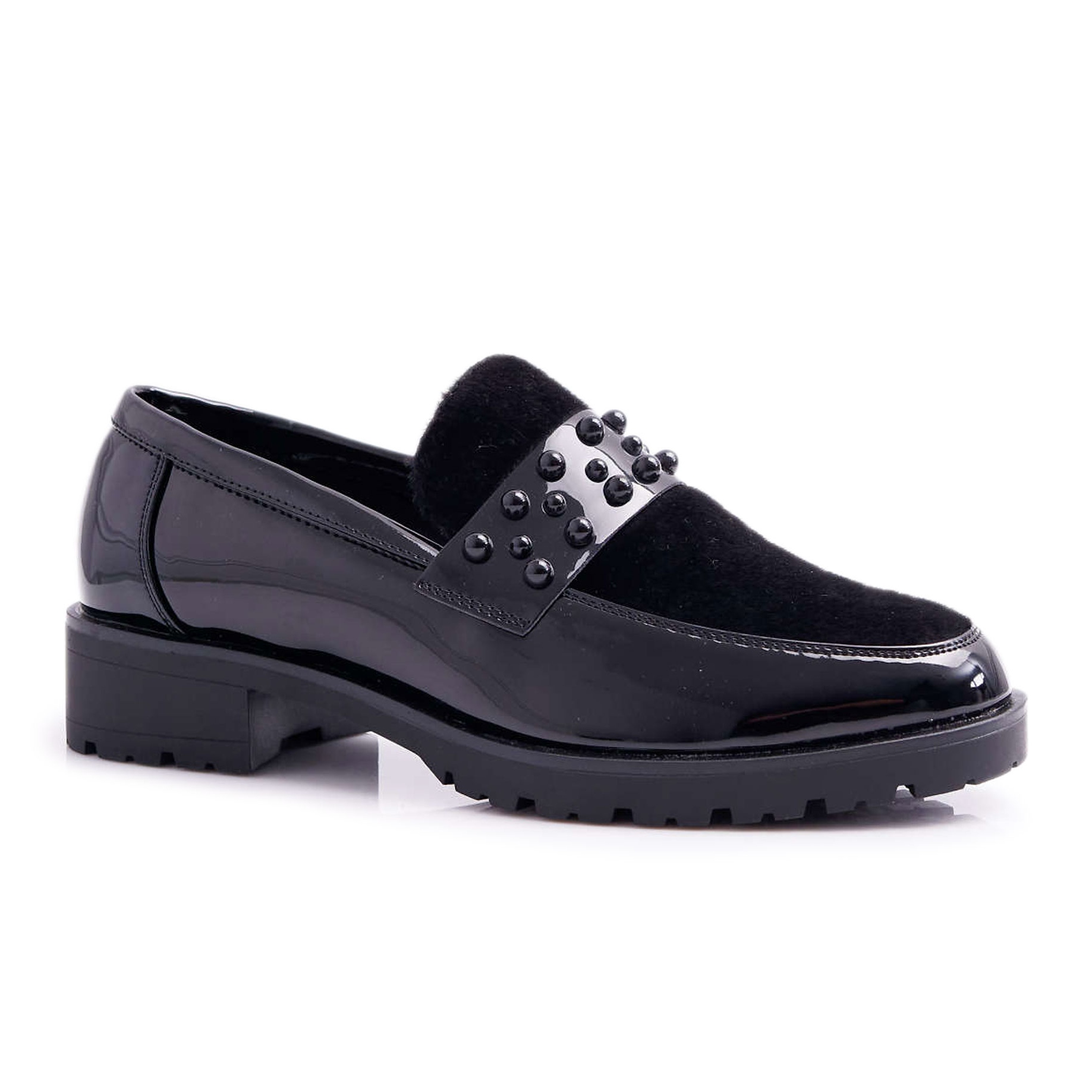 Den fashionabla lackerade färgen som används ger dem en unik karaktär, och pälsinsatsen på näsan tillsammans med känsliga svarta pärlor ger chic och originalitet. Skorna har en tjock, platt 4 cm hög klack, vilket ger stabilt stöd och komfort när de bärs hela dagen.