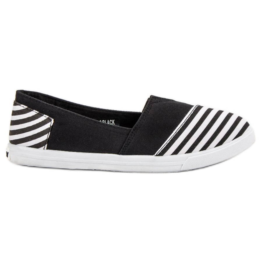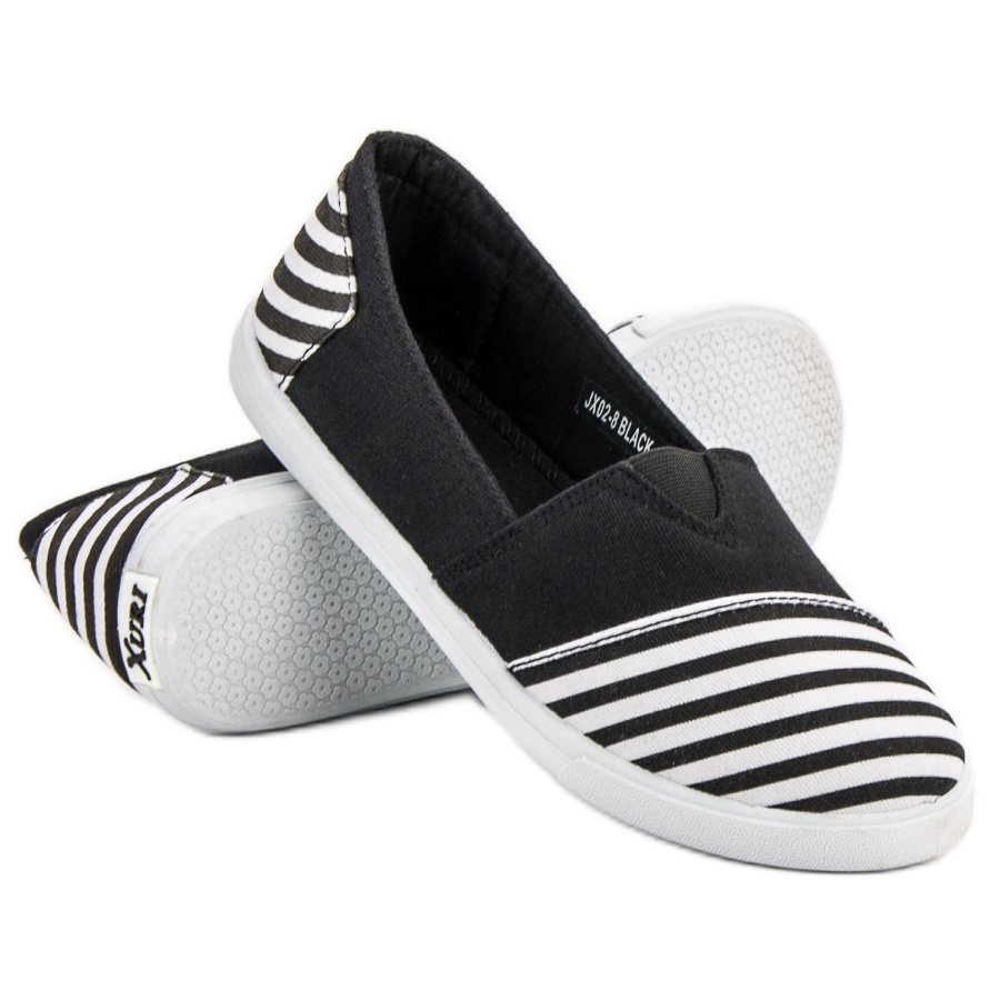 Deras karakteristiska design kännetecknas av en intressant kombination av enhetlig svart med svarta och vita ränder som ligger på tån och runt hälen, vilket gör dem fashionabla och originella. Slip-on-stängningen säkerställer enkel och snabb på- och avtagning, och den mjuka hälräknaren säkerställer komfort när du bär.