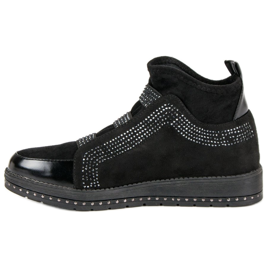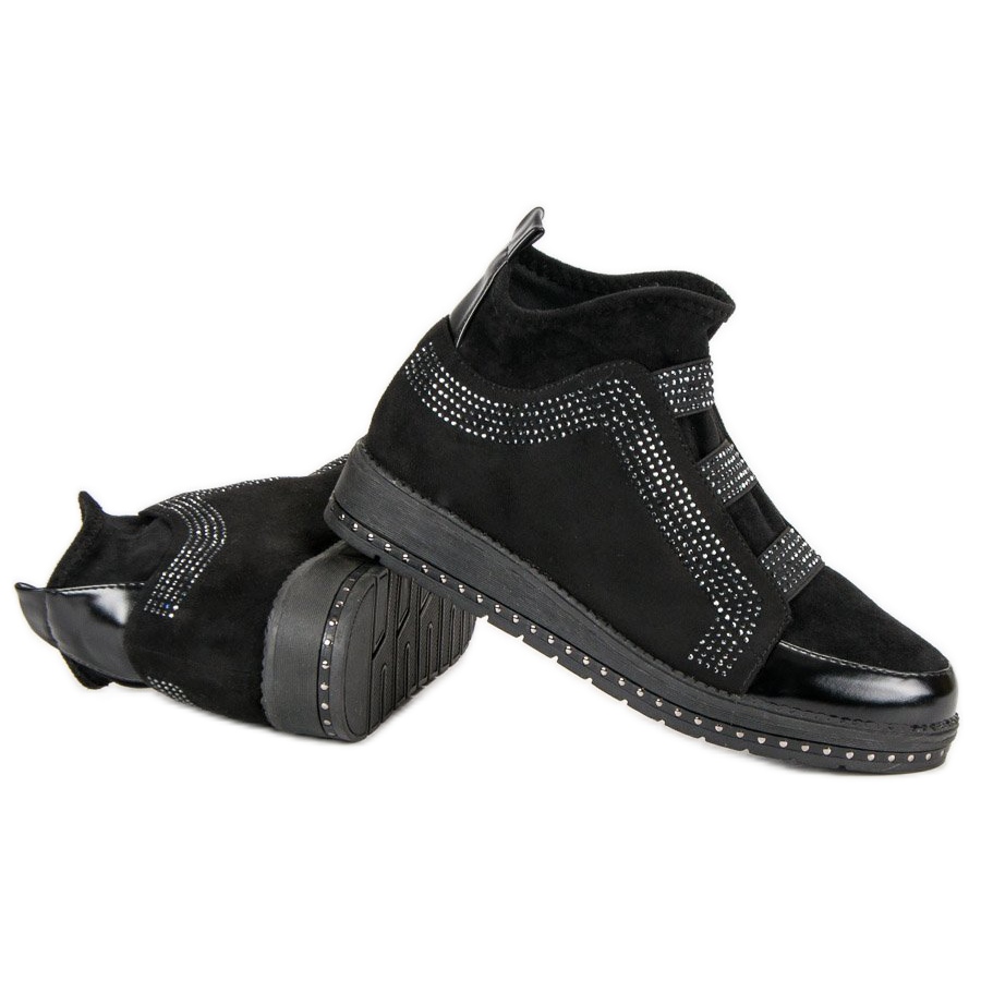Svarta slip-on sneakers är ett perfekt val för varje fashionabel kvinna som vill lägga till lite originalitet till sin styling. Dessa unika skor med dekorativa kristaller lockar inte bara uppmärksamhet, utan ger också komfort för vardagsbruk. De är perfekta för casual outfits, och kombinerar en sportig stil med en elegant accent.