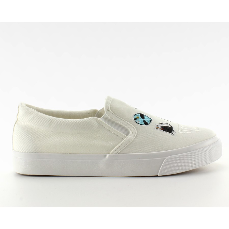 NB102P Vita slip-on sneakers med broderi - vita, snygga och bekväma. Tillverkad av tjock canvas, med en tjock och mjuk sula (2 cm) som absorberar varje steg. Slip-on modell - perfekt när du värdesätter snabba och bekväma lösningar. Säsongens mest fashionabla accent: broderi - varje sko har ett annat mönster, vilket ger paret en original, unik karaktär.