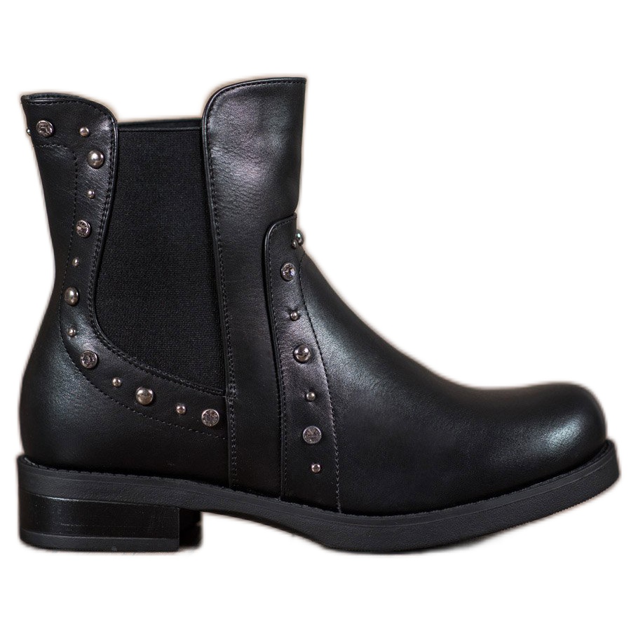 Upptäck en unik stil med Bestelle slip-on ankelboots med strass i elegant svart. Tillverkad av ekologiskt läder, kombinerar denna modell komfort och moderiktig design, som når över ankeln och säkerställer komfort under vardagliga aktiviteter. Tack vare gummiinlägg på båda sidor av ovandelen är det lättare än någonsin att ta på dem.