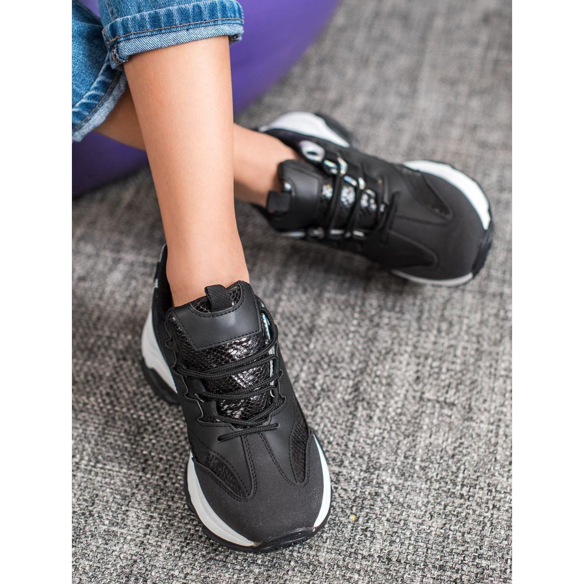 SHELOVET sneakers på Snake Print-plattformen i svart är ett idealiskt val för kvinnor som värdesätter moderiktig och bekväm stil. Deras unika ormskinnsmotiv gör att skorna ser extremt attraktiva ut, vilket ger elegans till varje vardagsstyling. Den massiva 5,5 centimeter höga plattformen förbättrar inte bara estetiken, utan garanterar också komfort när de bärs, vilket gör dem till ett utmärkt val för långa dagar på resande fot.