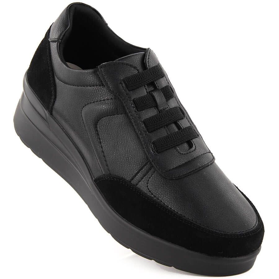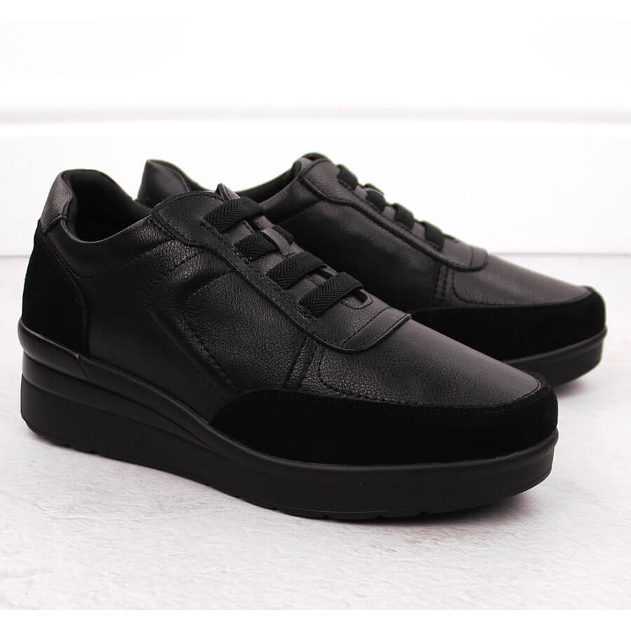 Här är ett idealiskt förslag för alla älskare av bekvämlighet och stil-kvinnors läderkil-sneakers från det berömda Sergio Leone-märket, PB236-S-modell. Dessa svarta skor är en absolut hit av säsongen, som kommer att fungera i både vardagliga och sportstyliseringar.