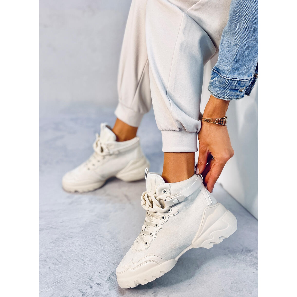 Skorna är gjorda av eko-läder och ekologisk mocka, vilket inte bara framhäver deras moderna karaktär, utan också värnar om miljön. Den beige färgen gör dem lätta att matcha till olika stilar - från vardagliga set till mer sportiga. Den ursprungliga avtagbara kedjan på ovandelen gör dem unika och gör att du sticker ut i mängden.