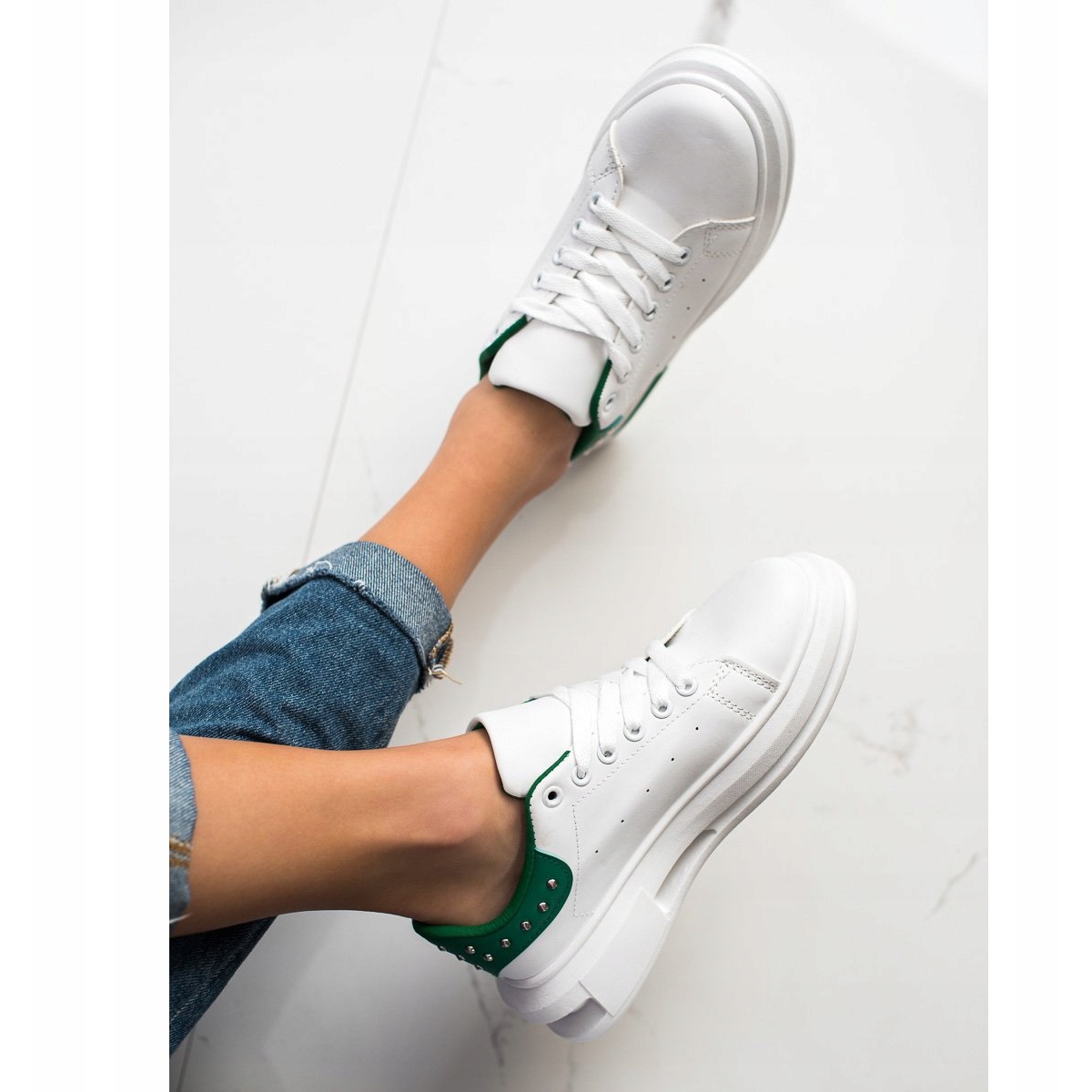 SHELOVET sneakers i vitt och grönt är ett perfekt val för kvinnor som letar efter vardagskomfort och stil. Dessa sportskor kännetecknas av en uppbyggd, mjuk klack och en fashionabel grön accent på baksidan, som är dekorerad med metall strass, vilket ger dem en unik karaktär.