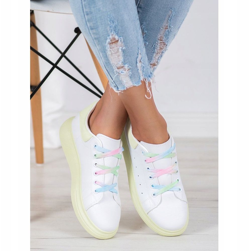 SHELOVET Sneakers med färgglada spetsar är den perfekta kombinationen av stil och komfort för moderna kvinnor. Dessa fashionabla skor finns i en elegant vit färg med gröna accenter som ger fräschör och karaktär. Sulan i syntetiskt material garanterar hållbarhet och komfort, och dess höjd på 4 cm gör varje steg till ett nöje.