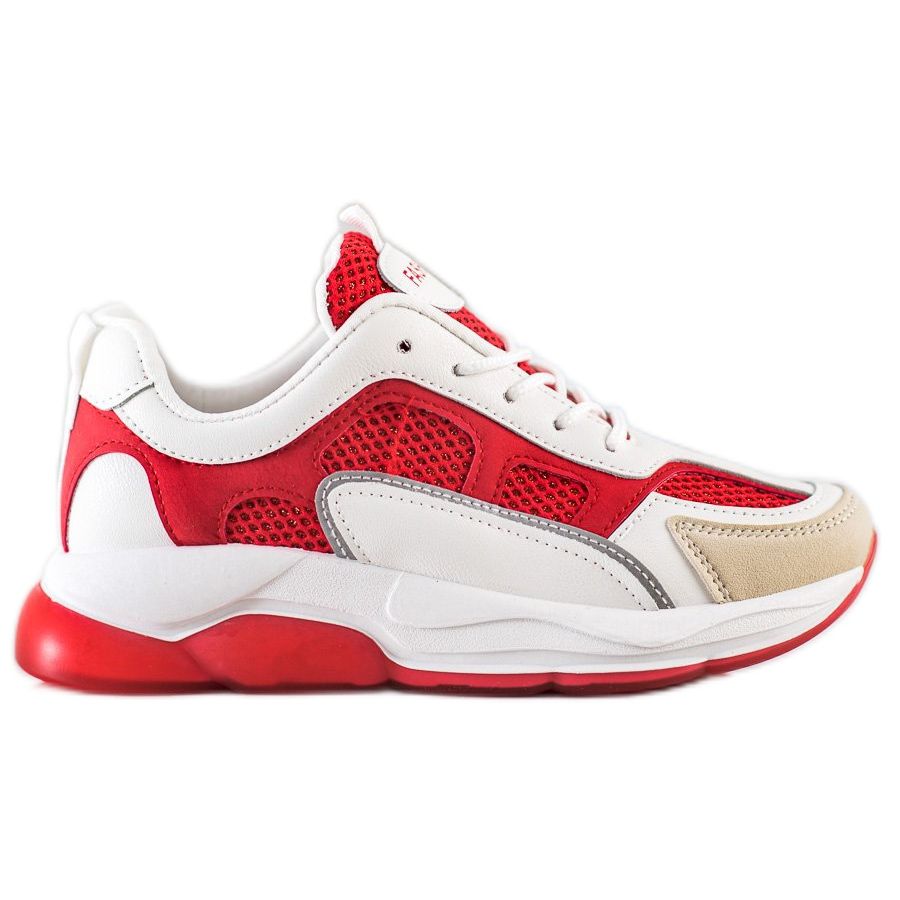 Den övre delen av skorna kännetecknas av intressanta färger - vita släta element, röda meshelement och beige förstärkning på tårna. Den röda delen, täckt med glänsande glitter, ger det hela en moderiktig och imponerande look, perfekt för modeälskare.