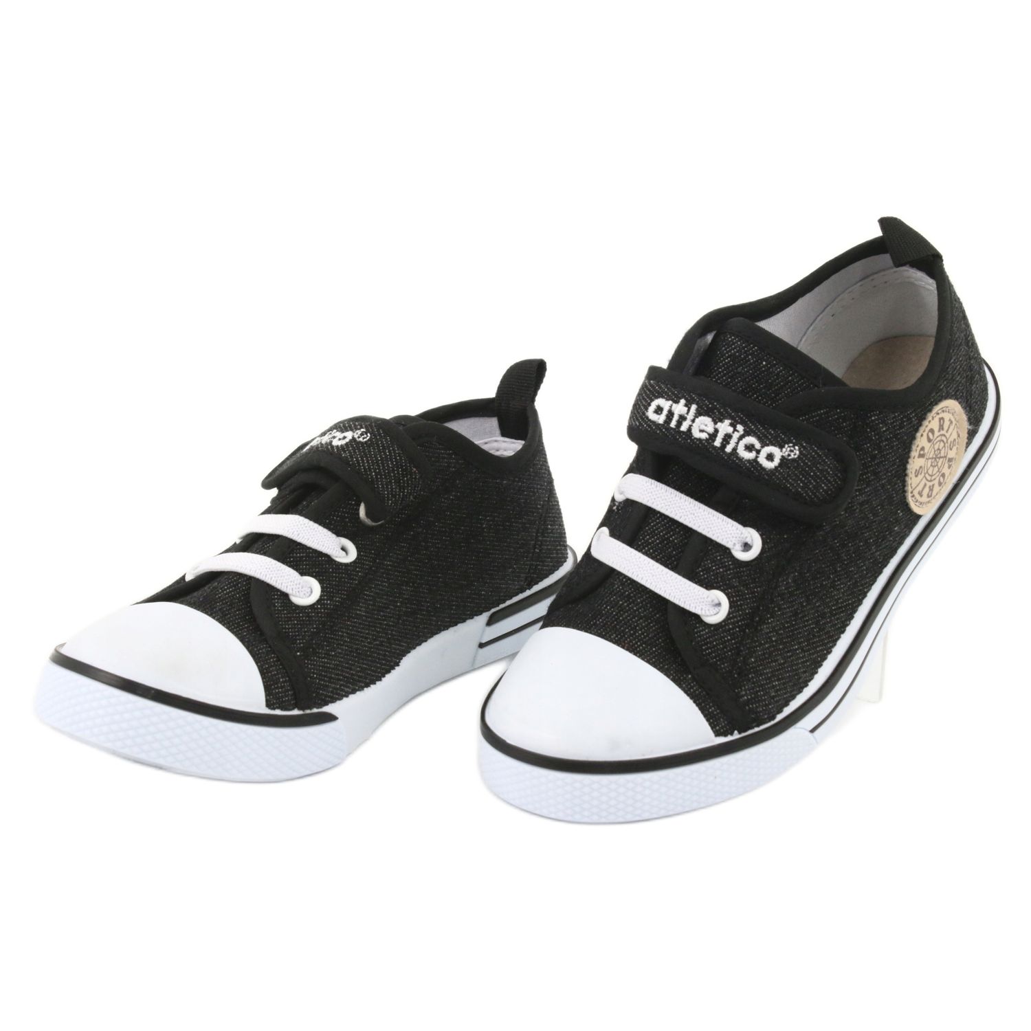 Klassiska barns sneakers Atletico BSM029 i svart med denimfinish Kombinera komfort med universell design. Textilöverdelen och en mjuk, vit sula säkerställer komfort hela dagen, och läderinsatsen bryr sig om hygien och bättre passform på foten. Kardborrfästning gör det lättare att ta på sig och passa skon - idealisk för aktiva pojkar.