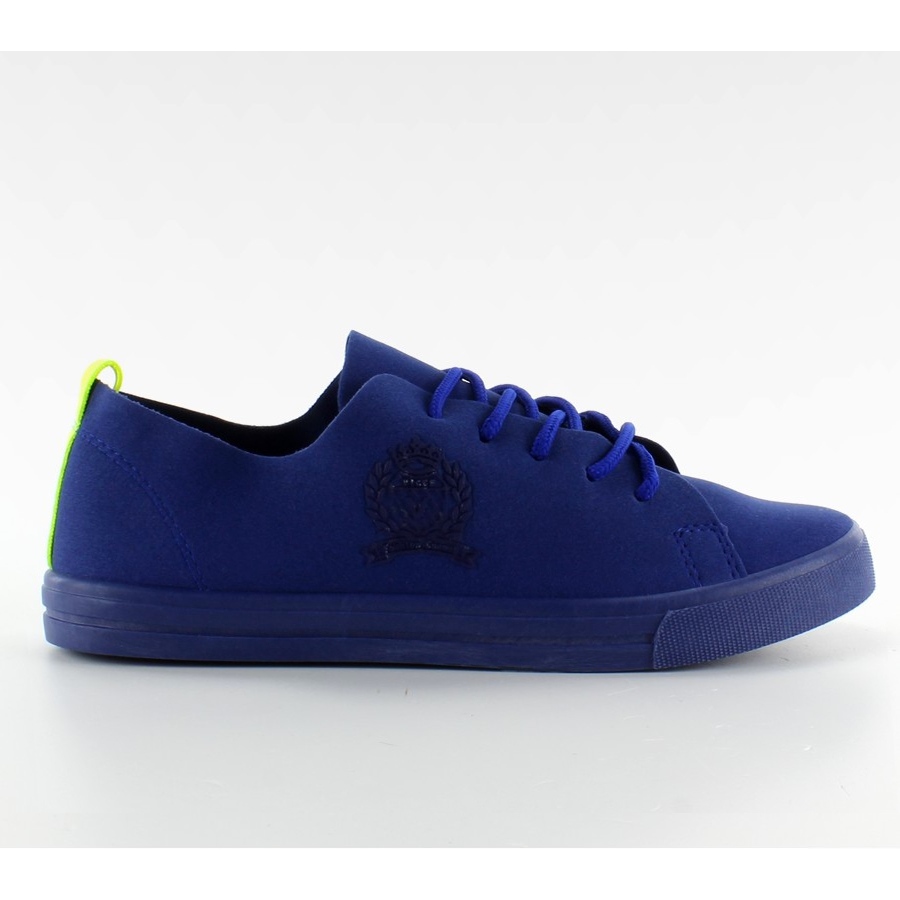 Unika sneakers gjorda av ett mycket originellt, mjukt material som liknar Alcantara. Behaglig att ta på, lätt och flexibel - perfekt för dagligt bruk. Den kontrasterande neonranden på baksidan ger karaktär, vilket passar perfekt till den mörkblå ovansidan och flerfärgade detaljer. Klassisk låg utförande och snörning säkerställer en bra passform på foten.