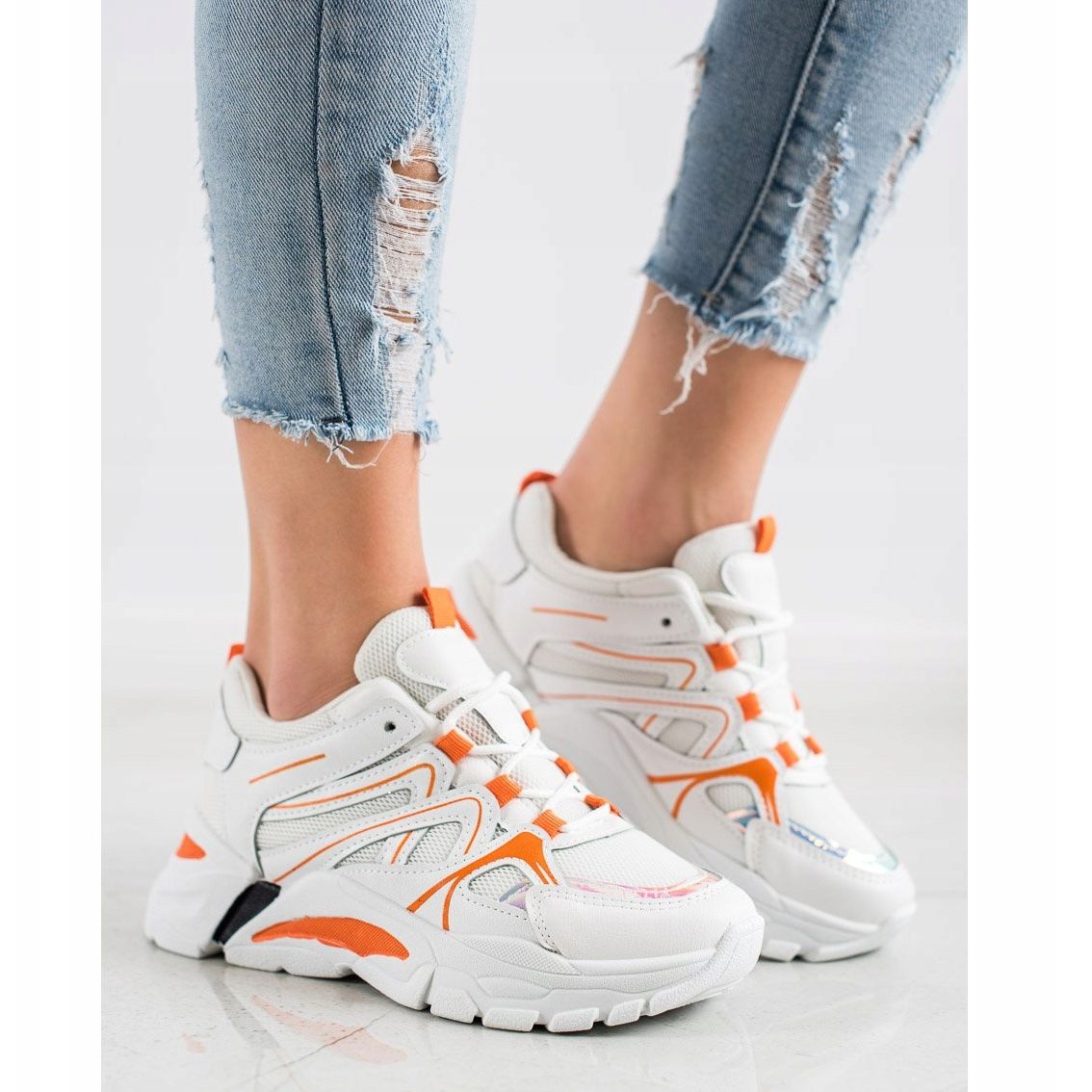 SHELOVET sneakers i vitt med ett djärvt orange inlägg är ett perfekt val för kvinnor som vill kombinera komfort med de senaste modetrenderna. Dessa snygga sportskor kommer säkerligen att dra till sig uppmärksamhet med sin moderna design och samtidigt ge hög komfort under vardagsbruk.