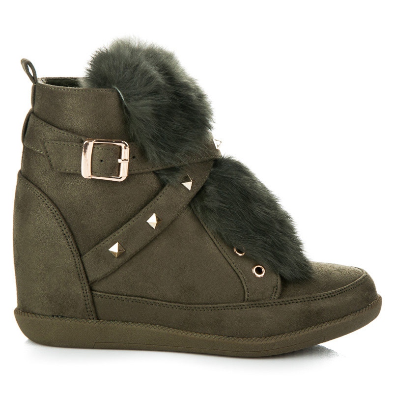 Dessa sneakers gläder inte bara med sin intensiva gröna nyans, utan också med dekorativ päls, vilket ger dem en extraordinär karaktär. Tack vare denna kombination kommer du att skapa en unik styling som säkert kommer att locka uppmärksamhet. Trots sin höjd garanterar sneakers exceptionell bärkomfort, vilket gör dem till ett idealiskt val för dagligt bruk.