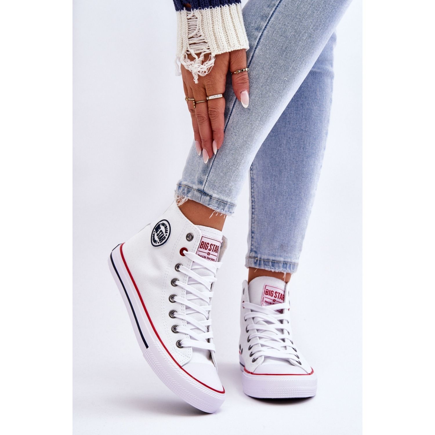 Sneakers Big Star T274026 White - Steg i stil är ett utmärkt val för kvinnor som värderar en kombination av komfort och fashionabla design. Höga sneakers från det berömda polska varumärket Big Star skiljer sig inte bara med estetik utan också med funktionalitet. Deras övre tillverkning av högkvalitativ tyg ser inte bara bra ut, utan ger också tillräcklig ventilation och komfort när du bär.