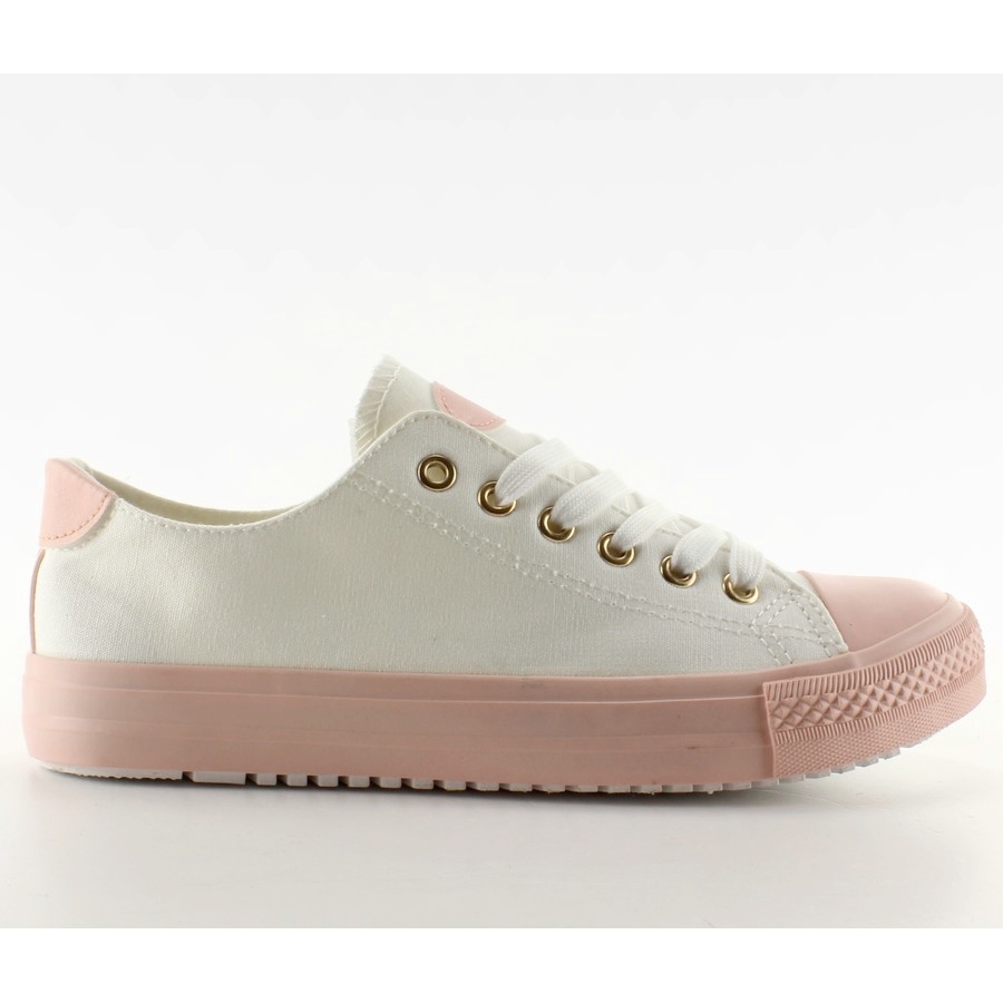Charmiga, låga damsneakers i originalversion - klassisk vit canvas kombinerad med subtilt, pastellgummi i rosa nyanser. Modellen med snyggt snitt, rundad tå och snörning kommer att vara perfekt för både vardag och ledig styling.