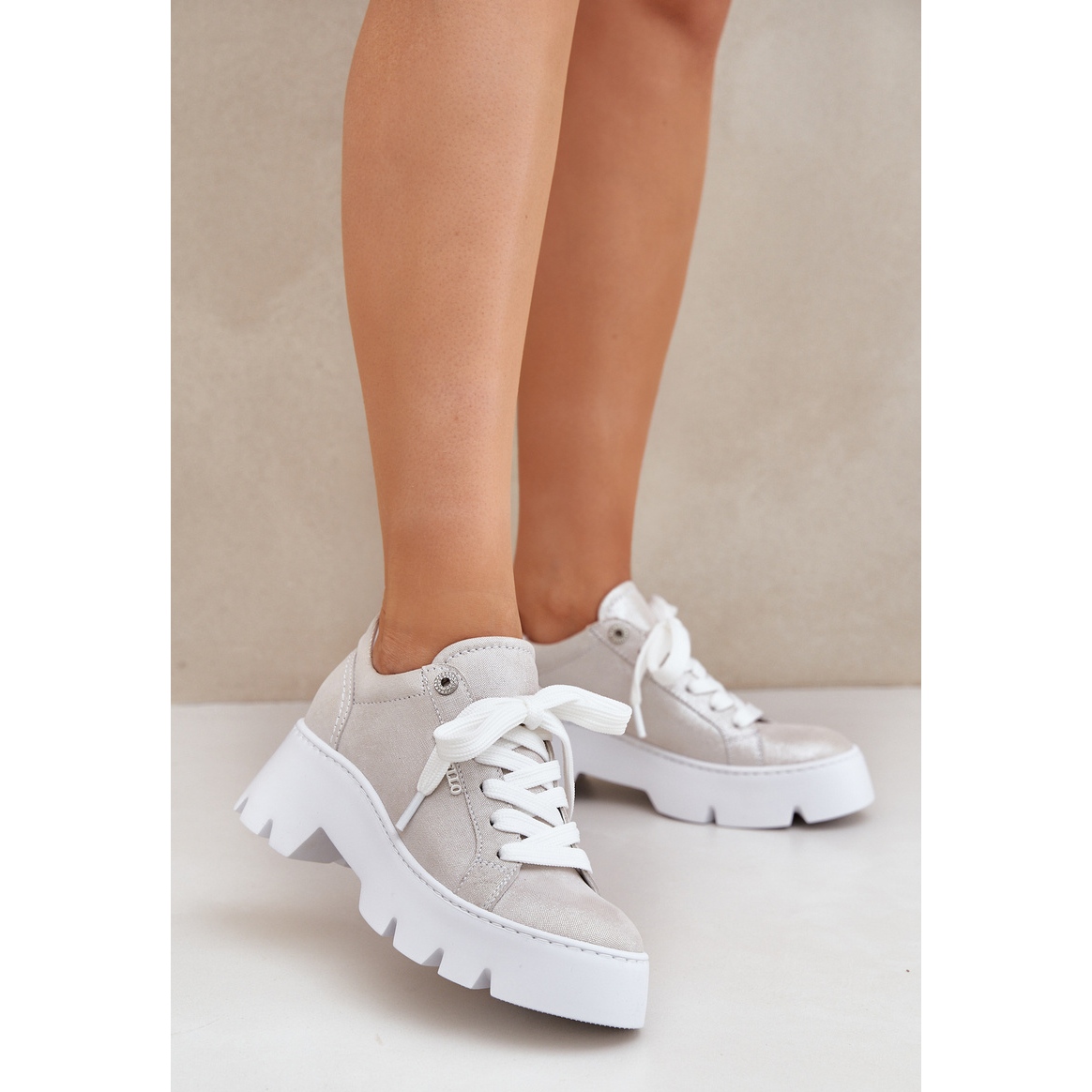 Beläget på en 3,5 cm hög och platt hälplattform med en höjd av 6 cm, erbjuder dessa sneakers stabilitet, tack vare vilka de är perfekta för både dagliga promenader och i en aktiv livsstil. Den runda näsan ger dem subtiliteter, och den universella silverfärgen passar effektivt in i de senaste modetrenderna, så att du enkelt kan kombinera med olika stiliseringar - från avslappnad till mer elegant.