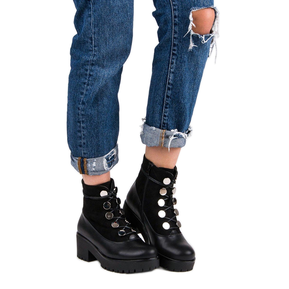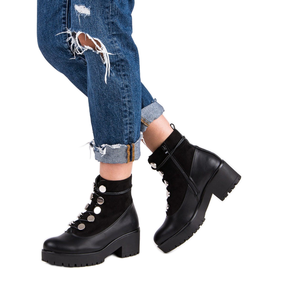 Snörsknäppningen säkerställer en perfekt passform, och den runda tån och den 6 cm platta hälen garanterar komforten att bära hela dagen. Den svarta färgen och minimalistiska designen gör dessa arbetare lämpliga för både vardagliga och mer eleganta outfits.