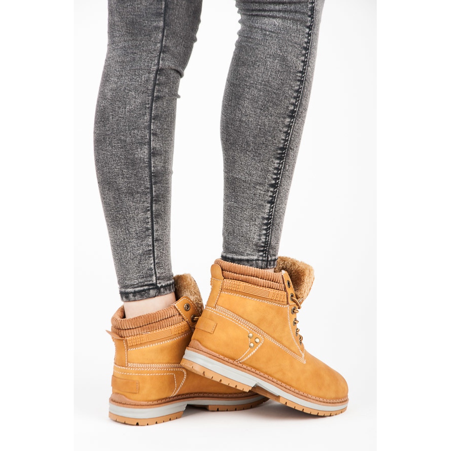 Dessa stövlar kännetecknas av en snörning, vilket möjliggör en perfekt passform till benet och frihet att använda. Den runda tån ger charm och den 3,5 cm platta hälen garanterar komfort även under en lång dag. Tack vare sin universella bruna färg matchar dessa skor perfekt med vardagliga, sportiga stilar.