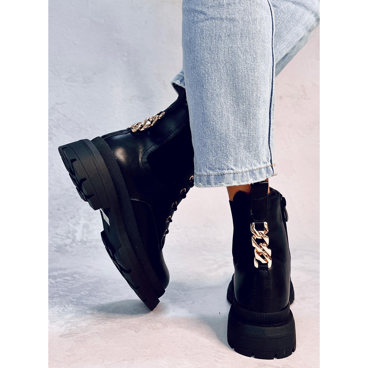 Klumpiga svarta stövlar - Svart, snörda med en dekorativ kedja