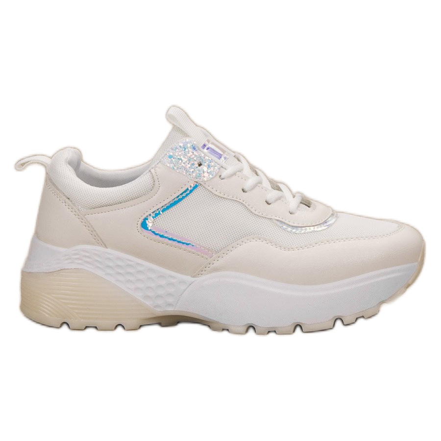 Upptäck den perfekta kombinationen av komfort och stil med vita SHELOVET sneakers med snörning. Dessa modeskor, tack vare en liten 5 cm hög plattform, formar benen perfekt, vilket gör att de ser smalare och mer eleganta ut. Glitteraccenter ger en touch av chic till varje styling, vilket gör den här modellen lämplig för både vardagskläder och sportkläder.